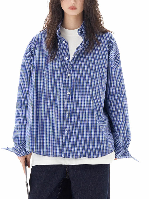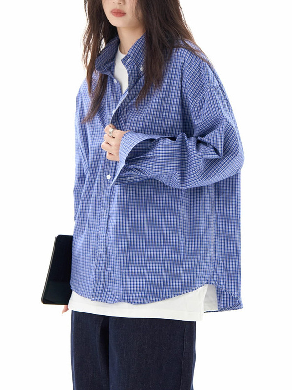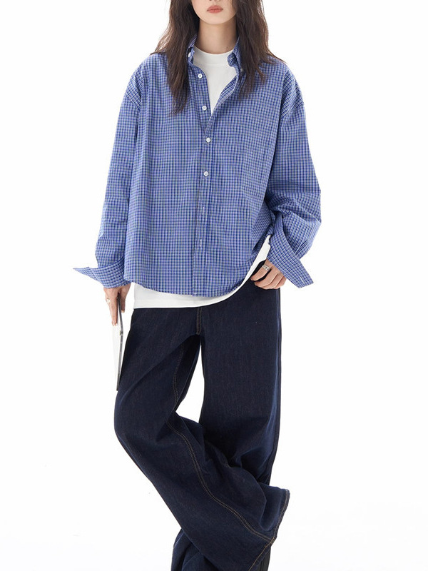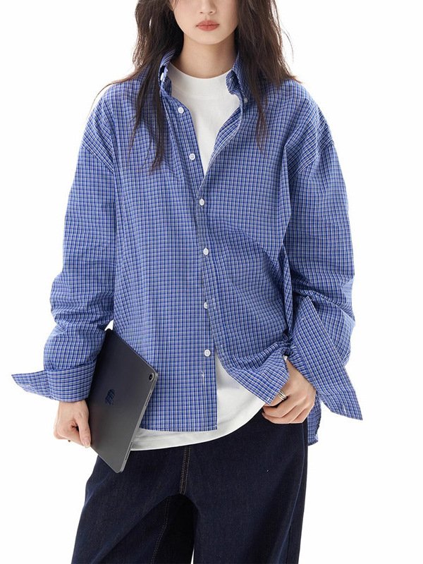 American Retro Blue Plaid Shirt Long-sleeved Men's and Women's High-end Sense Casual Loose All-match Couple's Shirt Jacket Trendy