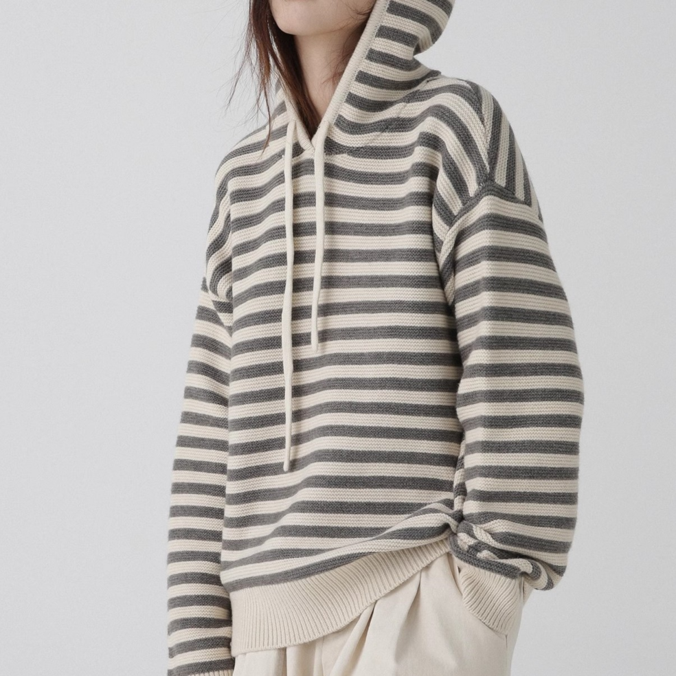 'Grey Rhyme Line' Autumn and Winter New Knitted Hooded Sweater Horizontal Stripe Outer Top