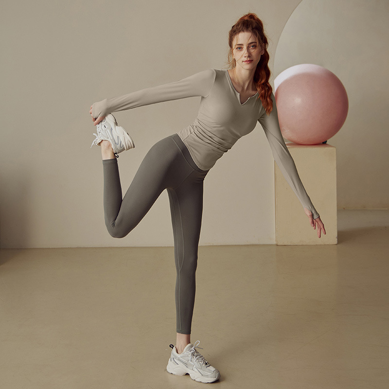 Yoga Suit with Chest Mat Women's Spring and Autumn Sports Long Sleeve T-shirt Professional Pilates Training Fitness Running V-neck Top